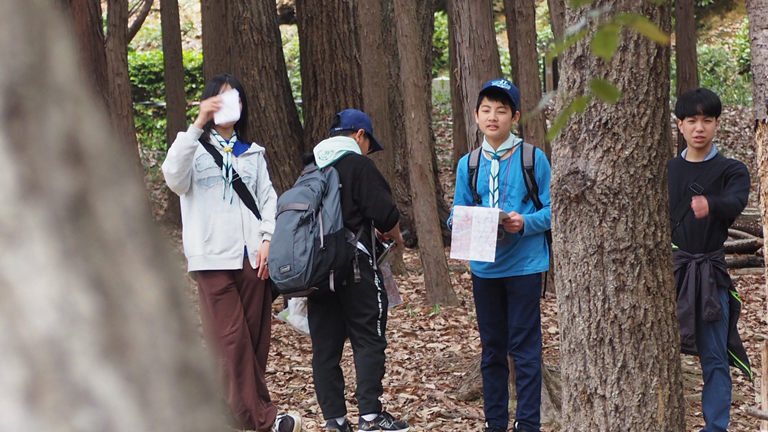 合同オリエンテーリングでは旗を立てるポールを竹で結んで作った。そのほかには竹と木で梯子も作りみんなで作業して班長さんがしっかり指示をしてくれて頼りになると思いました。(月の輪隊・daigo)