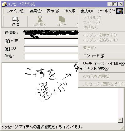 それで。そんなこといわれたってどうすればいいのという方へ、普通の(一般にHTMLメールとの区別でテキストメールと呼ばれる)メールで送るための設定の仕方をれくちゅあします。